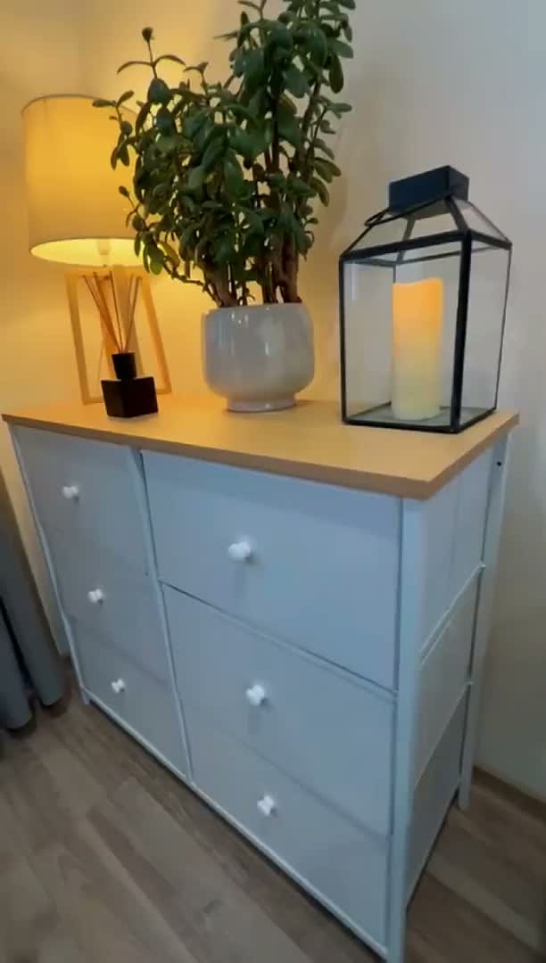 Această comodă stilată combină țesătura albă cu decorul natural de stejar, fiind soluția ideală pentru organizarea zilnică. Fie că o așezi în dormitor pentru lenjerie, în hol pentru accesorii sau în camera copilului pentru jucării, oferă întotdeauna suficient spațiu datorită celor 6 sertare spațioase. Datorită construcției sale ușoare, se mută cu ușurință, dar rămâne stabilă datorită întăriturilor și posibilității de fixare pe perete. Aspectul elegant și funcționalitatea sa practică o fac alegerea ideală pentru orice casă.