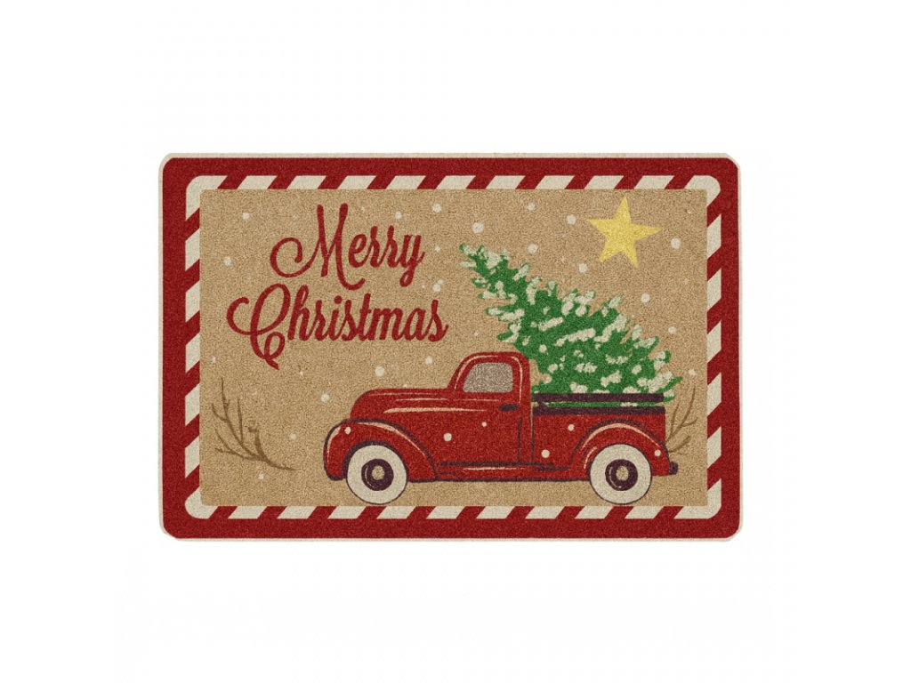 Preș de Crăciun HOLIDAY RIDE aduce o atmosferă festivă veselă chiar de la pragul casei dumneavoastră. Preșul este dominat de un camion retro roșu cu un brad de Crăciun bogat decorat pe platformă și inscripția Merry Christmas, care adaugă un farmec întregii scene. Este fabricat dintr-un material de calitate superioară cu spate antiderapant, asigurând utilizarea sigură atât în interior, cât și la intrarea acoperită. Dimensiunea preșului este de 60 x 90 cm.