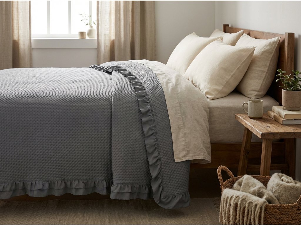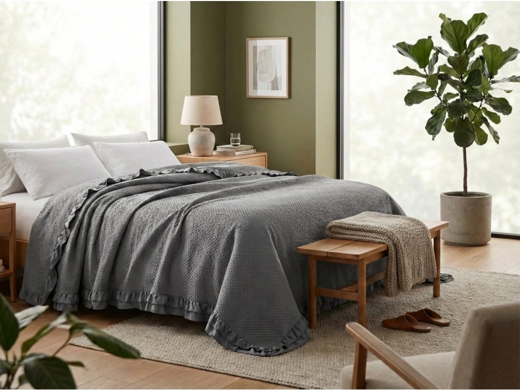 Cea mai ușoară cale de a desăvârși dormitorul este prin textile de casă. Combinația de plapume confortabile, pernuțe pufoase și covoare moi transformă dormitorul într-un loc primitor și armonios pentru relaxarea zilnică. Păturile vaflate sau matlasate protejează pilotele și lenjeria de pat de praf și, în același timp, conferă interioarelor un aspect îngrijit și elegant. Suprapunerea textilului simbolizează stilul danez hygge, care se bazează pe filozofia scandinavă a bucuriei momentelor simple. Înconjurați-vă de materiale plăcute și creați un spațiu în care să vă bucurați de momente liniștite cu familia și prietenii.