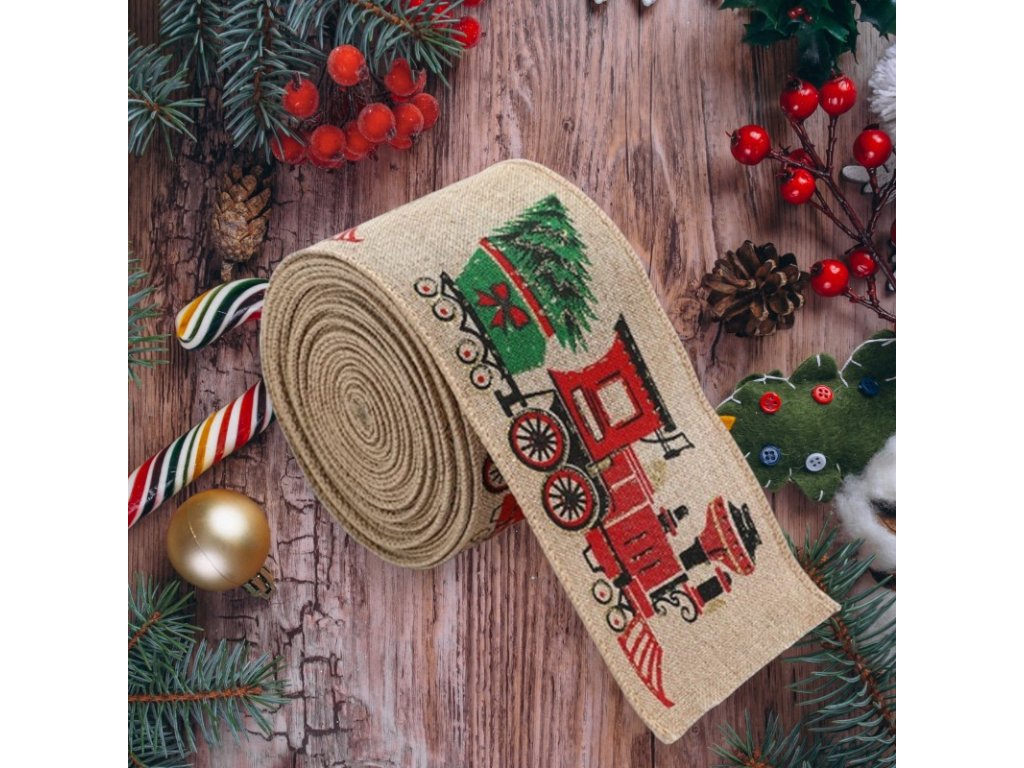 Panglica de Craciun CHRISTMAS TRAIN 6,3 cm x 2 m, bej