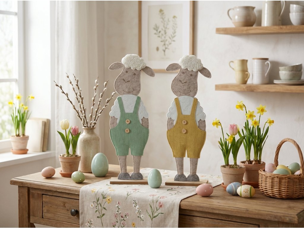Acești mielușei plstuiti în pantaloni veseli de primăvară aduc în fiecare casă joc și farmecul perioadei pascale. Datorită execuției fine și culorilor pastelate, par drăguți și eleganți – se evidențiază minunat pe o comodă, raft sau ca parte a mesei festive. Sunt un complement ideal pentru oricine dorește să aducă în interiorul său o bucată de atmosferă bucurie și să-și amintească de frumusețea primăverii în cea mai fermecătoare formă a sa.