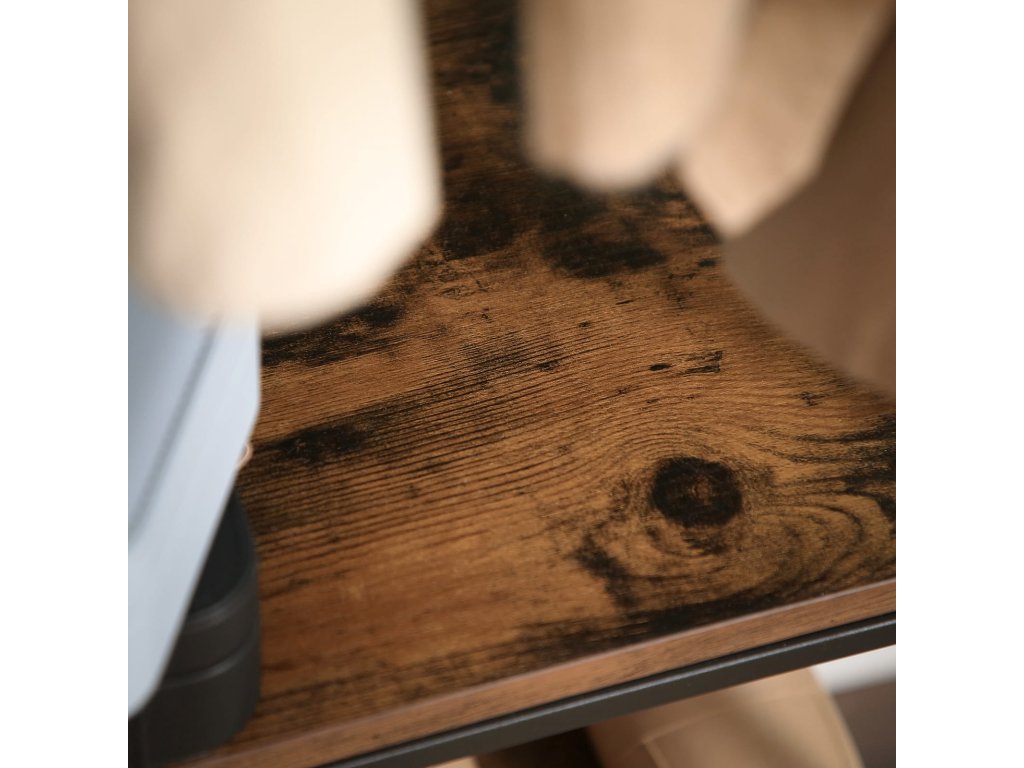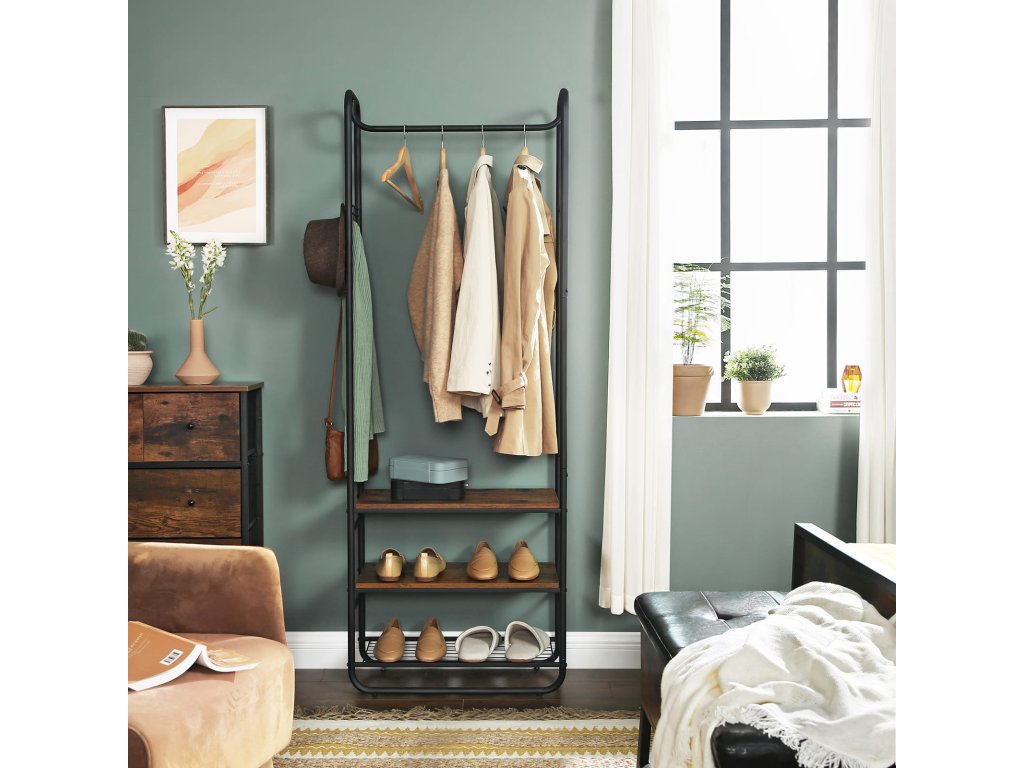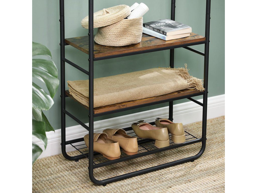 Acest cuier îngust cu bancă este o soluție ideală pentru holurile sau coridoarele mai mici. Oferă o combinație practică de cârlige, rafturi de depozitare și ședere, fără a ocupa mult spațiu. Cârligele glisante permit adaptarea aranjamentului după nevoie, iar banca oferă confort la încălțare. Datorită stilului industrial cu construcție metalică și detalii din lemn, va deveni un complement de bun gust pentru interiorul dumneavoastră, remarcându-se și prin funcționalitatea sa.