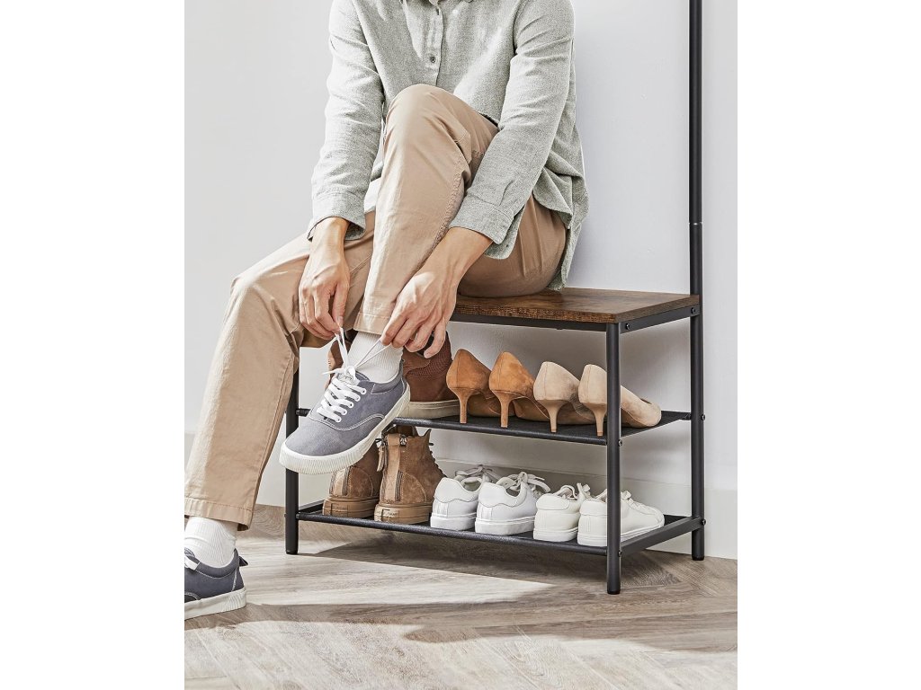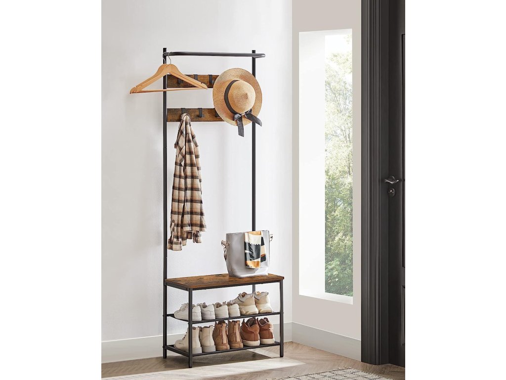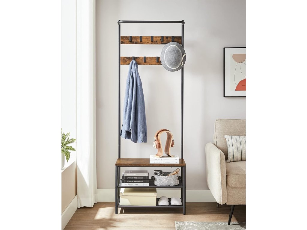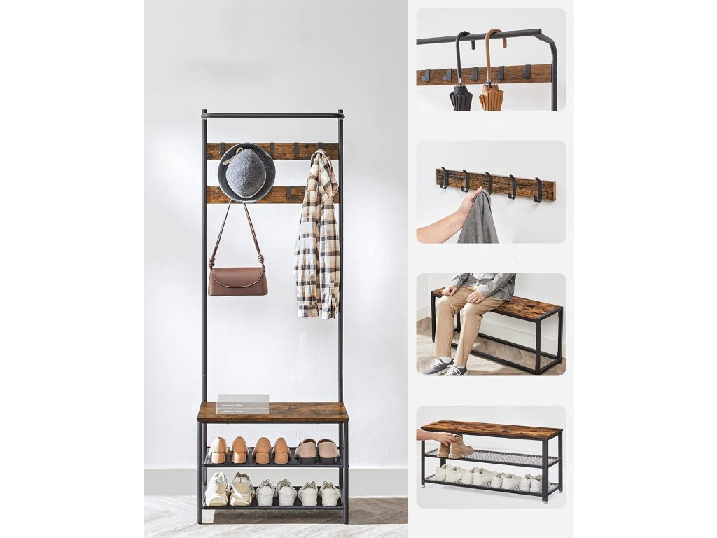 Acest cuier îngust cu bancă este soluția ideală pentru holuri sau coridoare mai mici. Oferă o combinație practică de cârlige, etajere și loc de ședere, fără a ocupa mult spațiu. Cârligele glisante permit adaptarea distribuției după necesitate, iar banca oferă confort la încălțare. Datorită stilului industrial cu construcție metalică și detalii din lemn, devine un complement rafinat al interiorului dumneavoastră, care impresionează și prin funcționalitate.