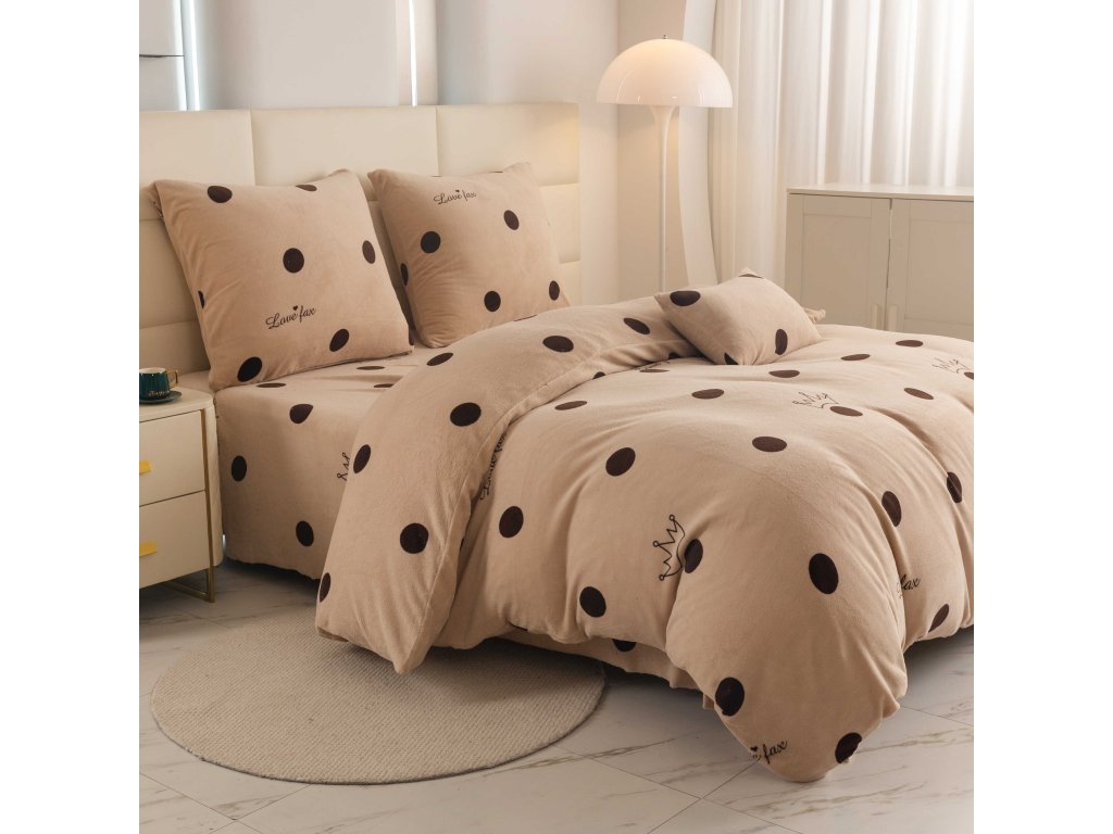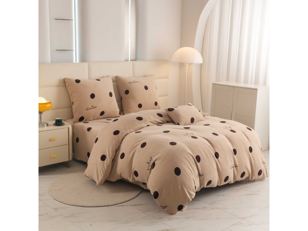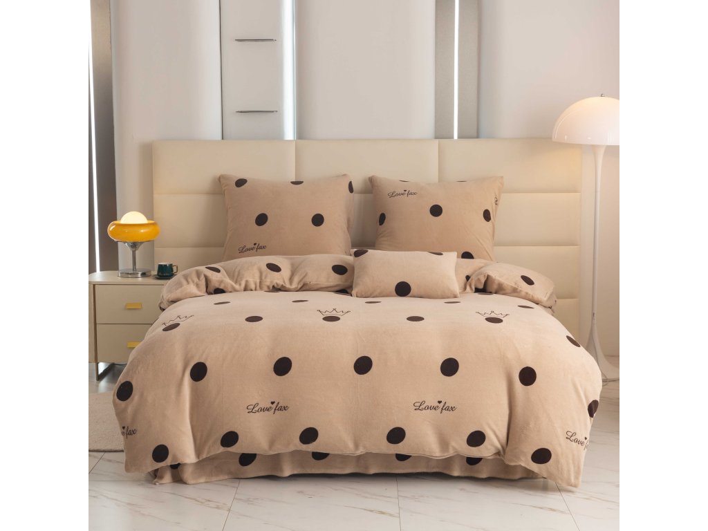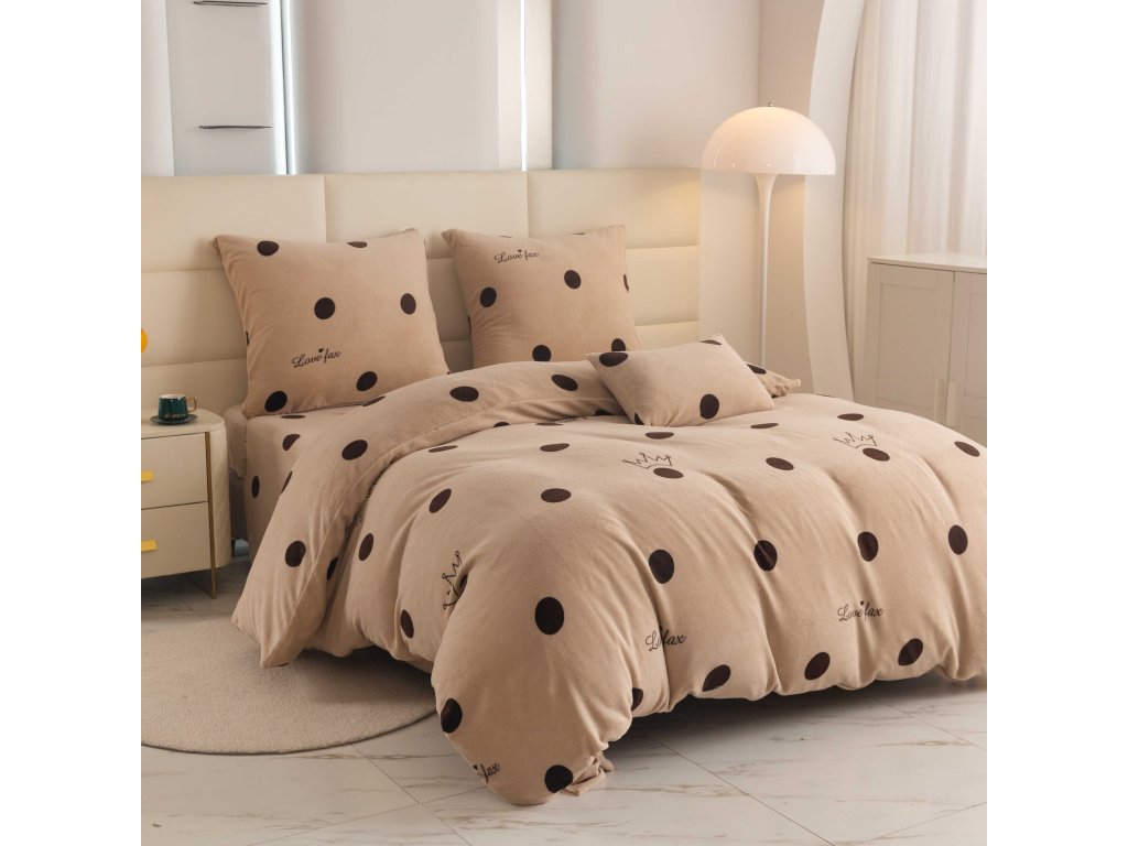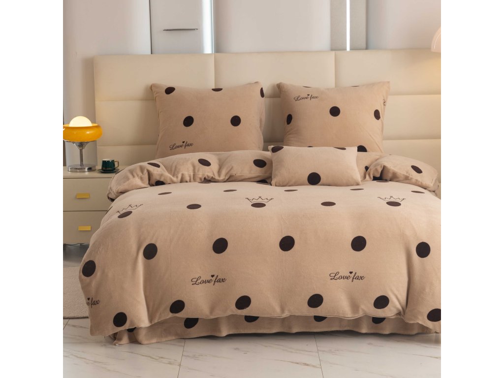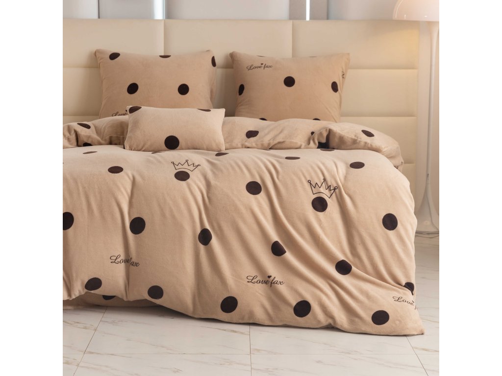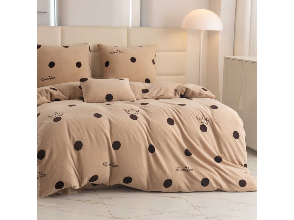 Lenjeria LOVE FAX în nuanța elegantă de bej cu buline maro pronunțate și coroane delicate conferă dormitorului dumneavoastră un aspect modern și jucăuș. Acest model va atrage nu doar iubitorii stilului discret, ci și pe cei care doresc să aducă un element original în dormitorul lor. Lenjeria are un sistem practic de închidere cu fermoar.