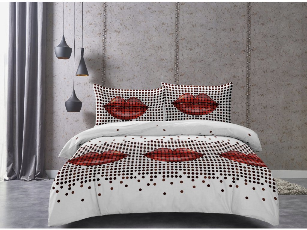 Lenjeria de pat din microfibră este o alegere practică pentru utilizarea zilnică datorită suprafeței sale delicate, stabilității formei și întreținerii simple. Materialul nu se șifonează, se usucă rapid și își păstrează aspectul pe termen lung. Motivul contrastant al buzelor roșii adaugă dormitorului un accent original și jucăuș, care atrage atenția la prima vedere, rămânând în același timp practic pentru utilizarea zilnică.