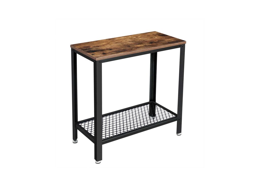 Datorită formei sale compacte și specificațiilor practice, această măsuță va deveni un aliat indispensabil în orice cameră. Oferă spațiul ideal pentru a așeza o carte, ceașca de cafea sau decorațiuni, în timp ce rafturile metalice inferioare sunt perfecte pentru depozitarea ordonată a revistelor, coșurilor sau electronicelor. Combinația de lemn și metal adaugă un aer industrial interiorului și se asortează cu ușurință cu diverse stiluri de design. Folosiți măsuța lângă canapea, în hol sau ca noptieră – posibilitățile sunt multe.