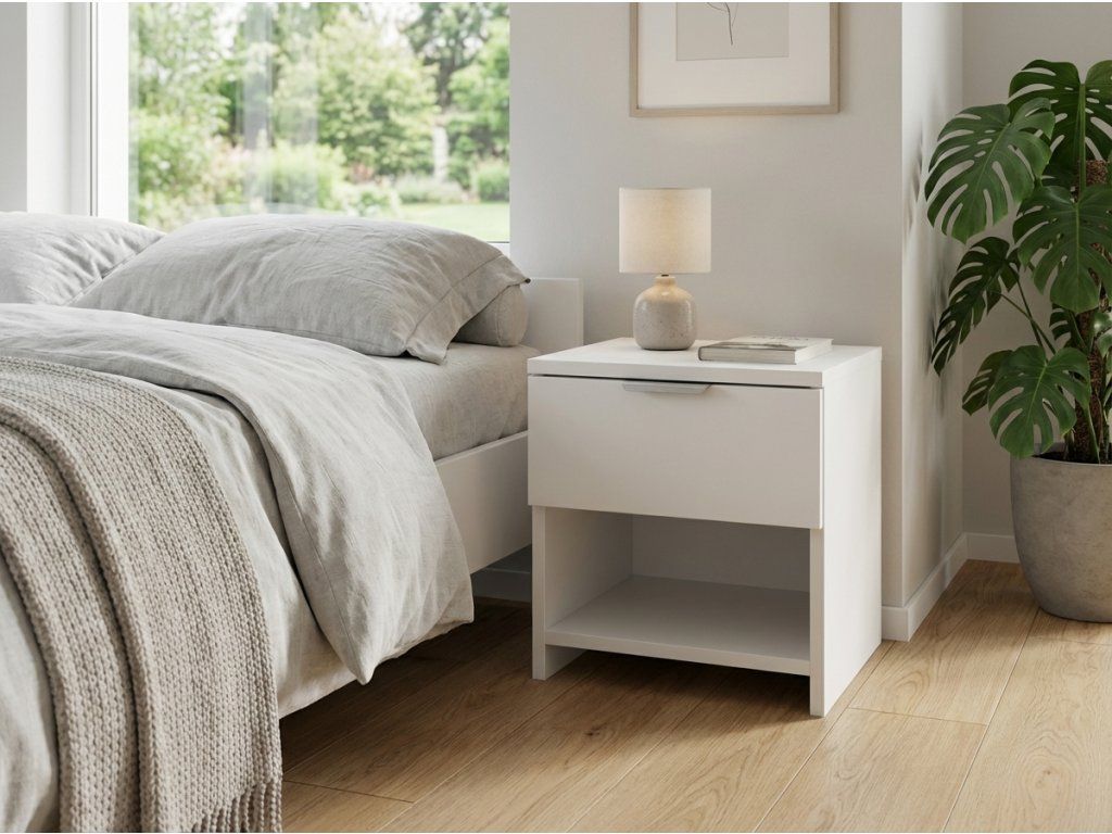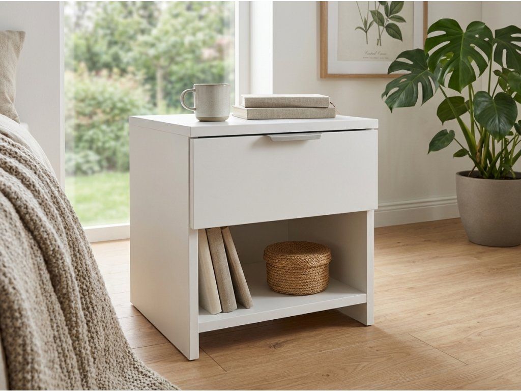 Noptiera este fabricată din placă laminată cu grosimea de 18 mm, ceea ce asigură rezistența și stabilitatea sa. Rezistă uzurii obișnuite și este potrivită pentru utilizarea zilnică ca suprafață de depozitare.