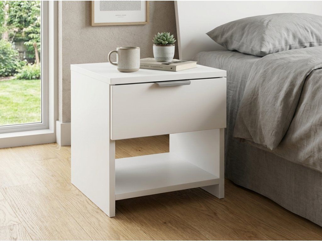 Pachetul include toate piesele necesare, inclusiv partea stângă și dreaptă a noptierei, sertarul, raftul superior și inferior, materialul de fixare și instrucțiunile. Totul este pregătit pentru o asamblare ușoară.