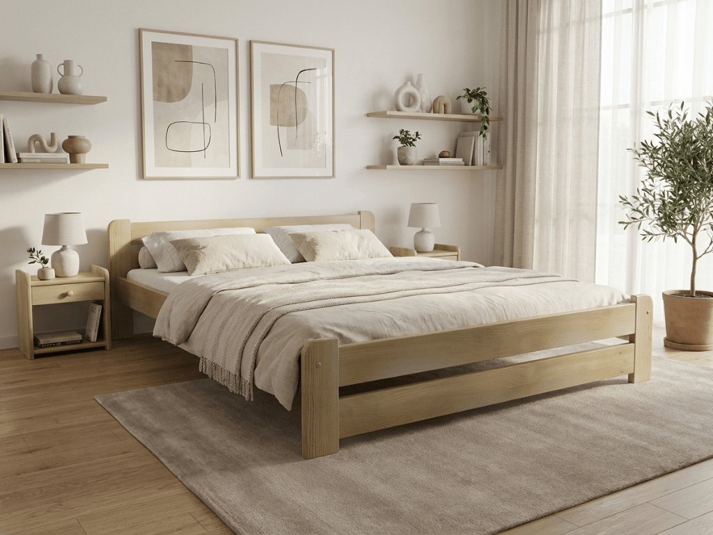 Aspectul lemnului de brad va lumina interiorul dormitorului. Lemnul de pin oferă un aspect natural, cu motivul distinctiv al inelelor anuale în nuanțe crem roșiatice. Pinul masiv oferă un aspect simplu care se încadrează în orice dormitor, cabane sau facilități de oaspeți. Nodurile mici arată natural și conferă patului o notă distinctă.