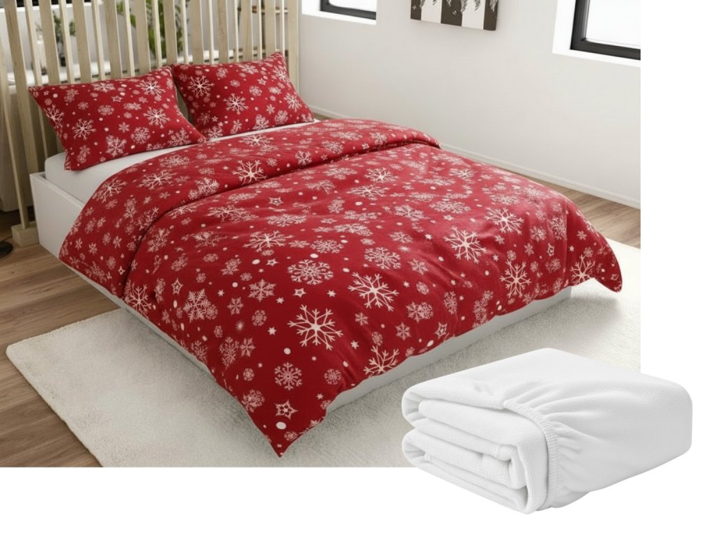 Set 2 buc Lenjerie cocolino SNOWFALL rosu + Cearsaf Cocolino microplus cu elastic SOFT 180x200 cm alb, pat dublu