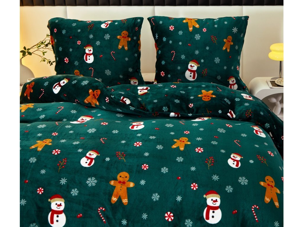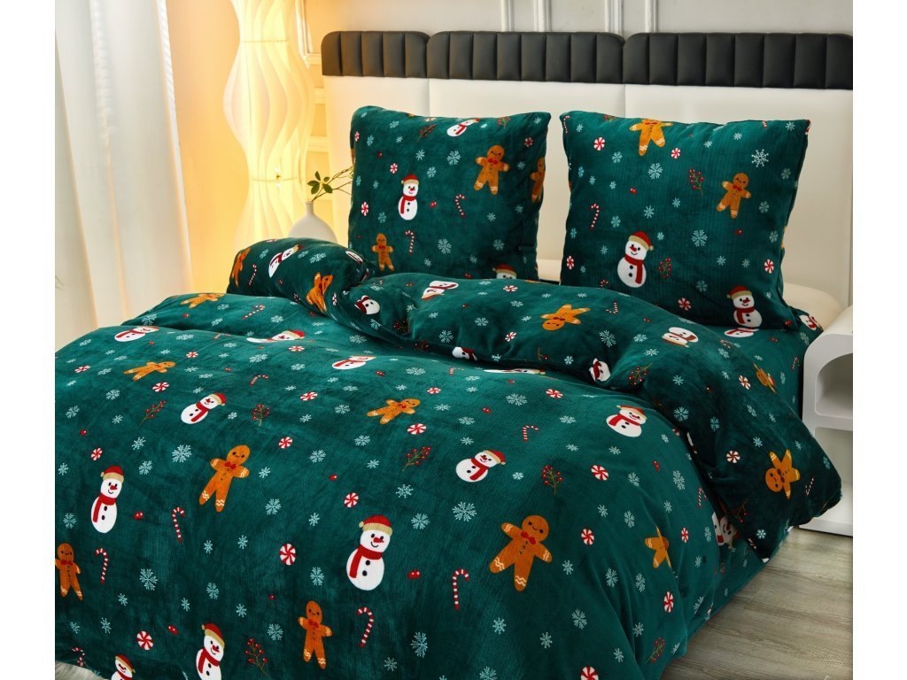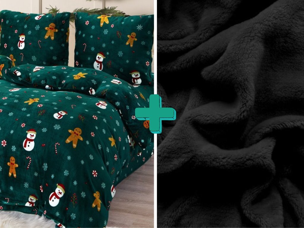 Lenjerie de pat din microplus SNOWMAN AND GINGERBREAD verde + cearsaf din microplus SOFT 90x200 cm negru