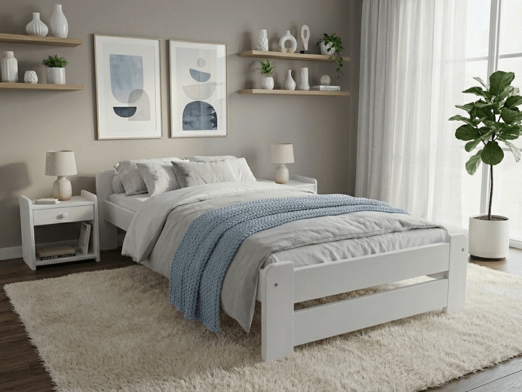 Un pat alb va contribui la un interior modern și curat. Această culoare neutră este populară de mulți ani și va fi întotdeauna la modă. Arată proaspăt și aerisit, se poate asorta ușor cu alte nuanțe de culori mai închise. Dormitorul va arăta calm și relaxant.