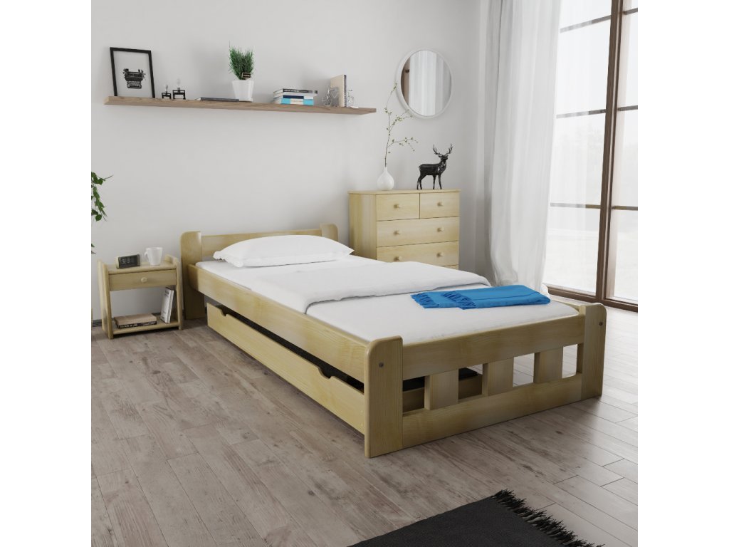 Aspectul lemnului de brad va lumina interiorul dormitorului. Lemnul de pin oferă un aspect natural, cu motivul distinctiv al inelelor anuale în nuanțe crem roșiatice. Pinul masiv oferă un aspect simplu care se încadrează în orice dormitor, cabane sau facilități de oaspeți. Nodurile mici arată natural și conferă patului o notă distinctă.
