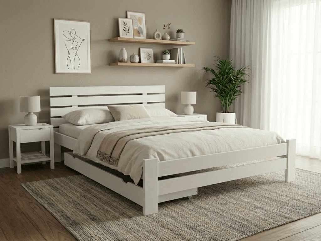 Un pat alb va contribui la un interior modern și curat. Această culoare neutră este populară de mulți ani și va fi întotdeauna la modă. Arată proaspăt și aerisit, se poate asorta ușor cu alte nuanțe de culori mai închise. Dormitorul va arăta calm și relaxant.