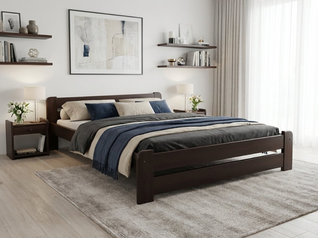 Pentru iubitorii de culori mai închise, decorul de nuc este ideal. Culoarea lemnului de nuc se aseamănă culorii ciocolatei întunecate. Interiorul dormitorului va arata impresionant și cu gust. Creați un interior modern prin contrastul unui interior luminos în nuanțe crem sau alb cu patul în culoarea naturală a nucului.