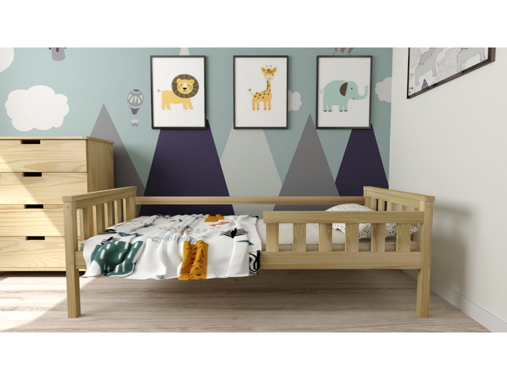 Patul pentru copii MONTY în culoarea naturală a lemnului de pin îmbină funcționalitatea, estetica și beneficiile sănătoase. Prin folosirea lemnului masiv și a lacului blând, creează un mediu sigur și sănătos pentru odihna zilnică. Tăbliile mai înalte adaugă un aspect plăcut patului și oferă sprijin pentru citit sau relaxare. Acest model este ideal pentru părinții care preferă materialele naturale și durabilitatea pe termen lung a mobilierului în camera copiilor.