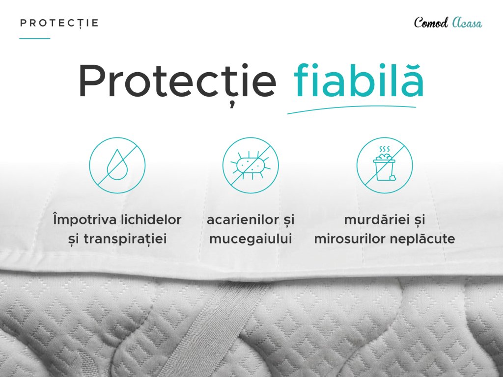 Protecția saltelei este mai importantă decât credeți. Fiecare persoană, fie copil sau adult, transpiră în mod natural. În timpul nopții transpirăm până la un litru de transpirație, care se impregnează în cearceafuri și în miezul saltelei. O protecție pentru saltea va crește igiena generală a patului. În plus, protejează împotriva deteriorării mecanice, murdăriei, acarienilor, transpirației și urinei. Este un excelent ajutor pe pătuțurile pentru copii sau pentru primele paturi. Și pentru adulți are locul său ca o protecție obișnuită pentru saltea, pentru vârstnici sau pentru pacienții care sunt imobilizați la pat. Protecția impermeabilă creează un strat protector și etanș pentru fluide. Nu trebuie să vă îngrijorați că ați putea avea senzația că dormiți pe o folie de plastic, stratul superior al protecției este fabricat din microfibră care este prietenoasă cu pielea și plăcută la atingere.
