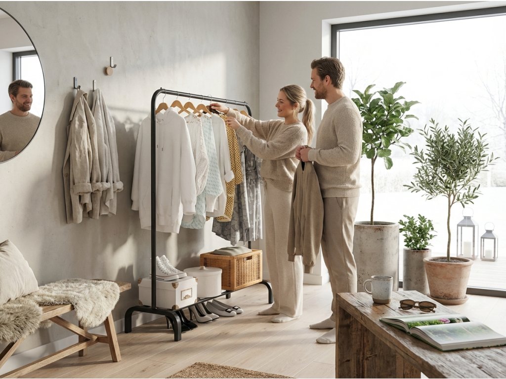 Acest suport multifuncțional pentru haine este soluția ideală pentru cei care caută un mod eficient de a-și organiza garderoba. Datorită poliței și barei pentru umerașe, oferă suficient spațiu pentru depozitarea hainelor, accesoriilor sau pantofilor. Este perfect pentru dormitor, dressing sau hol. Designul elegant se potrivește perfect în interioarele industriale și ajută la menținerea ordinii. Organizați-vă spațiul și bucurați-vă de confort în fiecare zi.