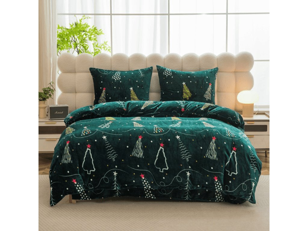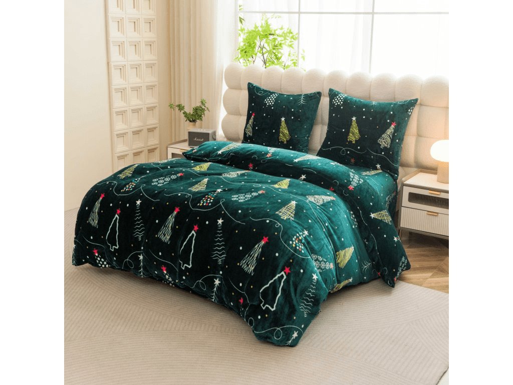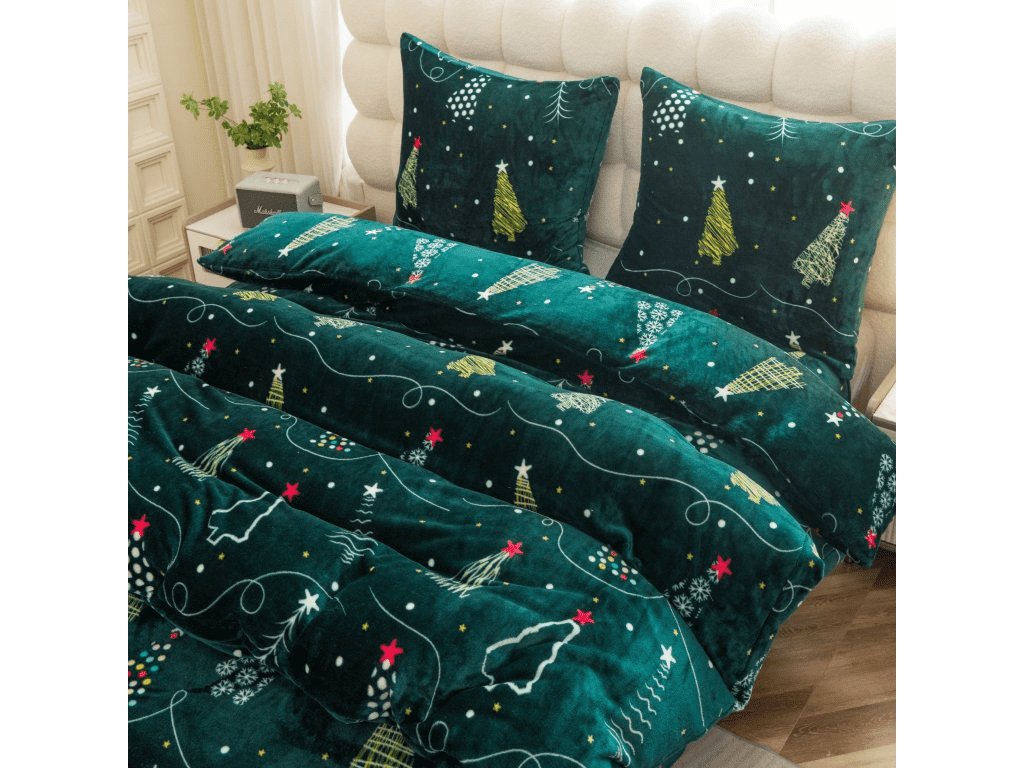 Sada mikroplyšového povlečení CHRISTMAS DRIFT zelené + prostěradlo mikroplyš SOFT 90x200 cm bílé, jednolůžko