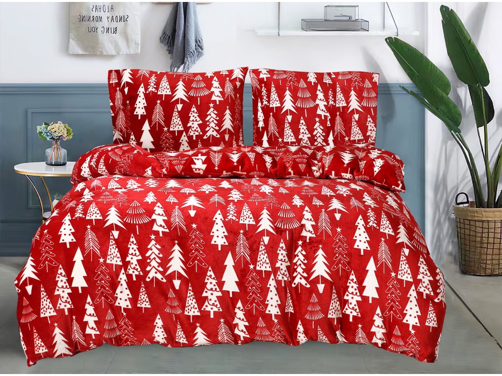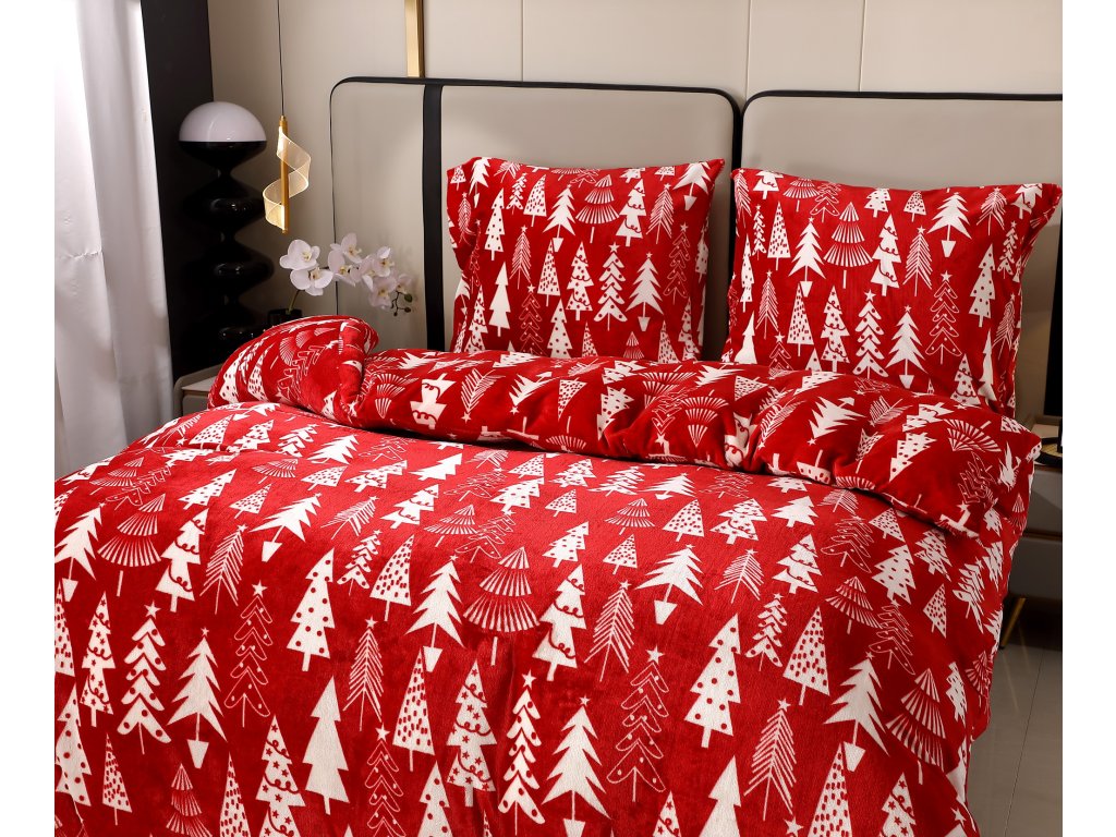 Sada mikroplyšového povlečení CHRISTMAS TREES červené + prostěradlo mikroplyš SOFT 180x200 cm bílé, dvoulůžko