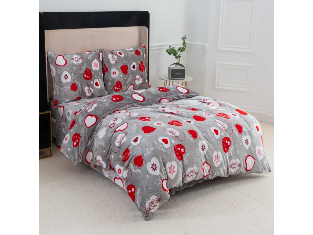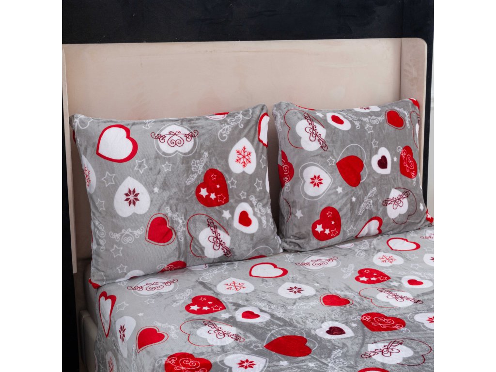 Set 2 bucati lenjerie cocolino INIMI DE CRACIUN gri + cearsaf Cocolino microplus cu elastic MOALE 180x200 cm alb, pat dublu