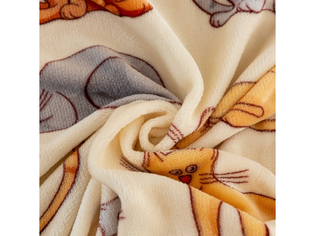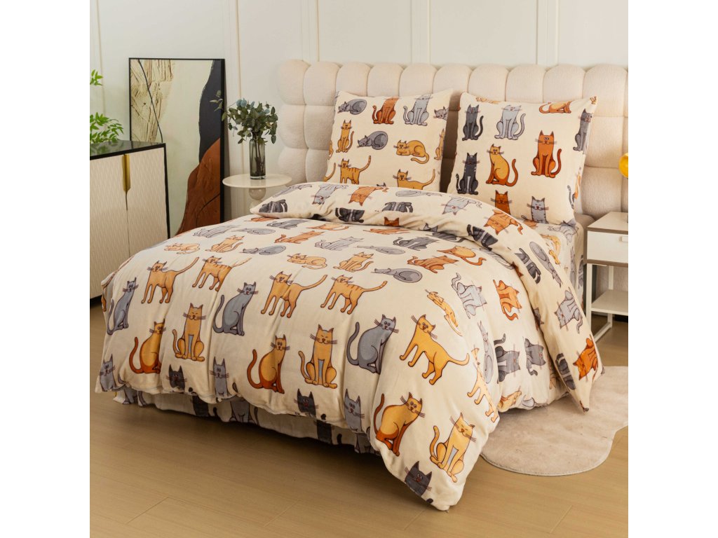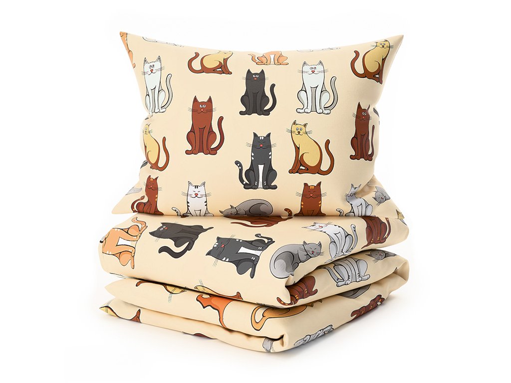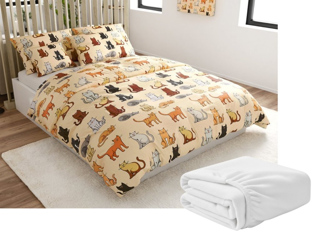 Set Lenjerie cocolino COLORED CATS crema + Cearsaf Cocolino microplus cu elastic SOFT 180x200 cm alb, pat dublu