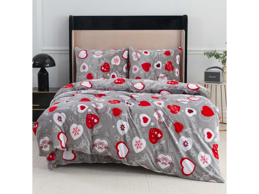 Set Lenjerie cocolino VÁNOČNÍ SRDCE gri + CearsaF Cocolino microplus cu elastic SOFT 180x200 cm alb, pat dublu