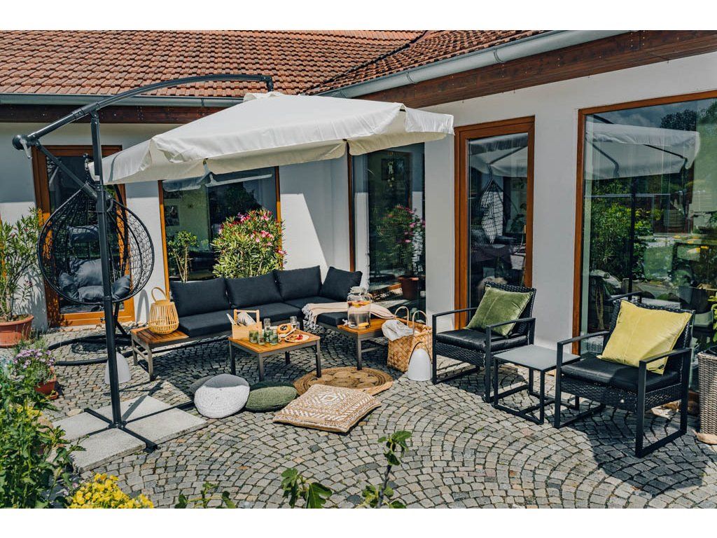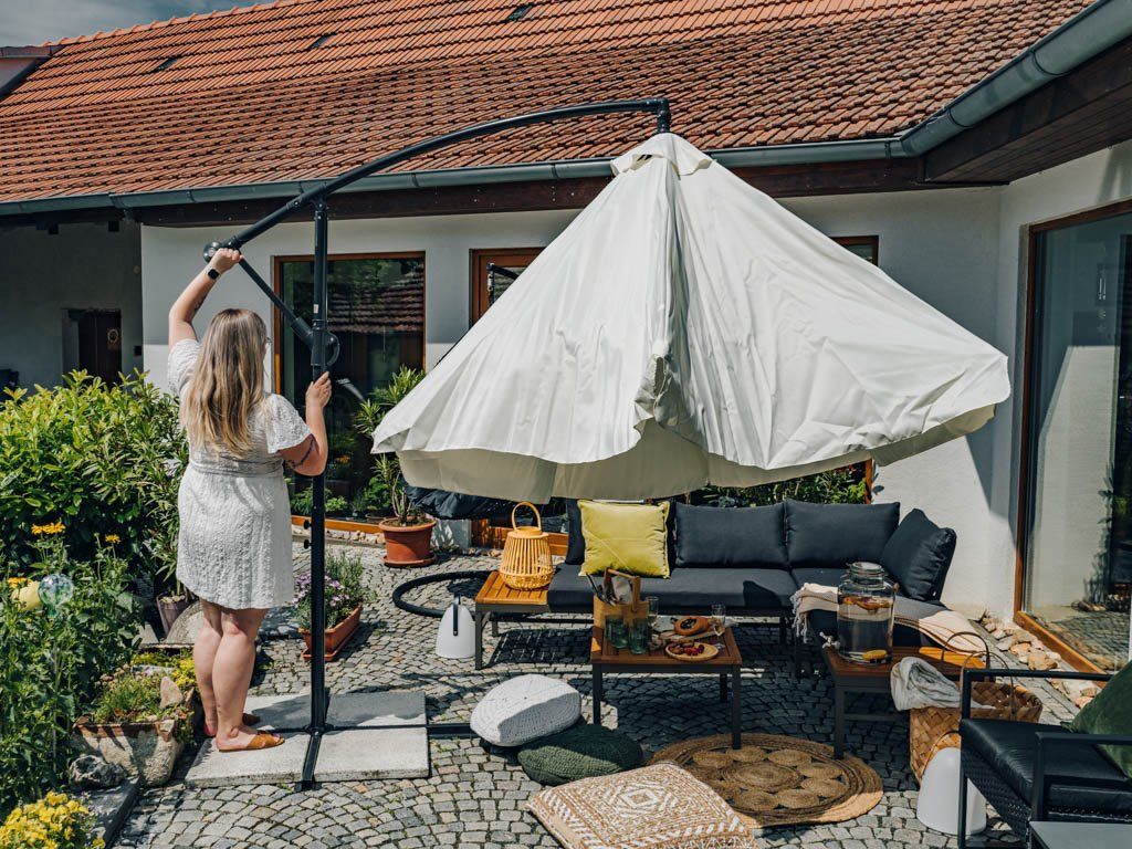 Utilizarea pe termen lung și expunerea la lumina soarelui pot schimba nuanța de culoare a umbrelei. Nu lăsați umbrela de soare deschisă în condiții meteorologice nefavorabile. În timpul vântului foarte puternic, vă recomandăm să pliați umbrela de soare pentru a evita deteriorarea.